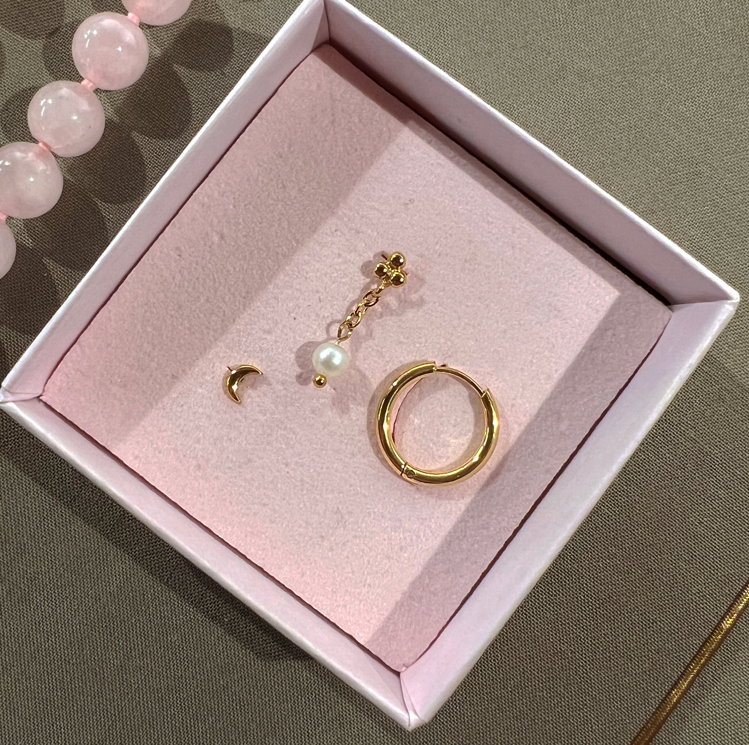 1 Thebe måne ørestik, 1 Alma ørering, 1 Aria ørestik med ferskvandsperle.
