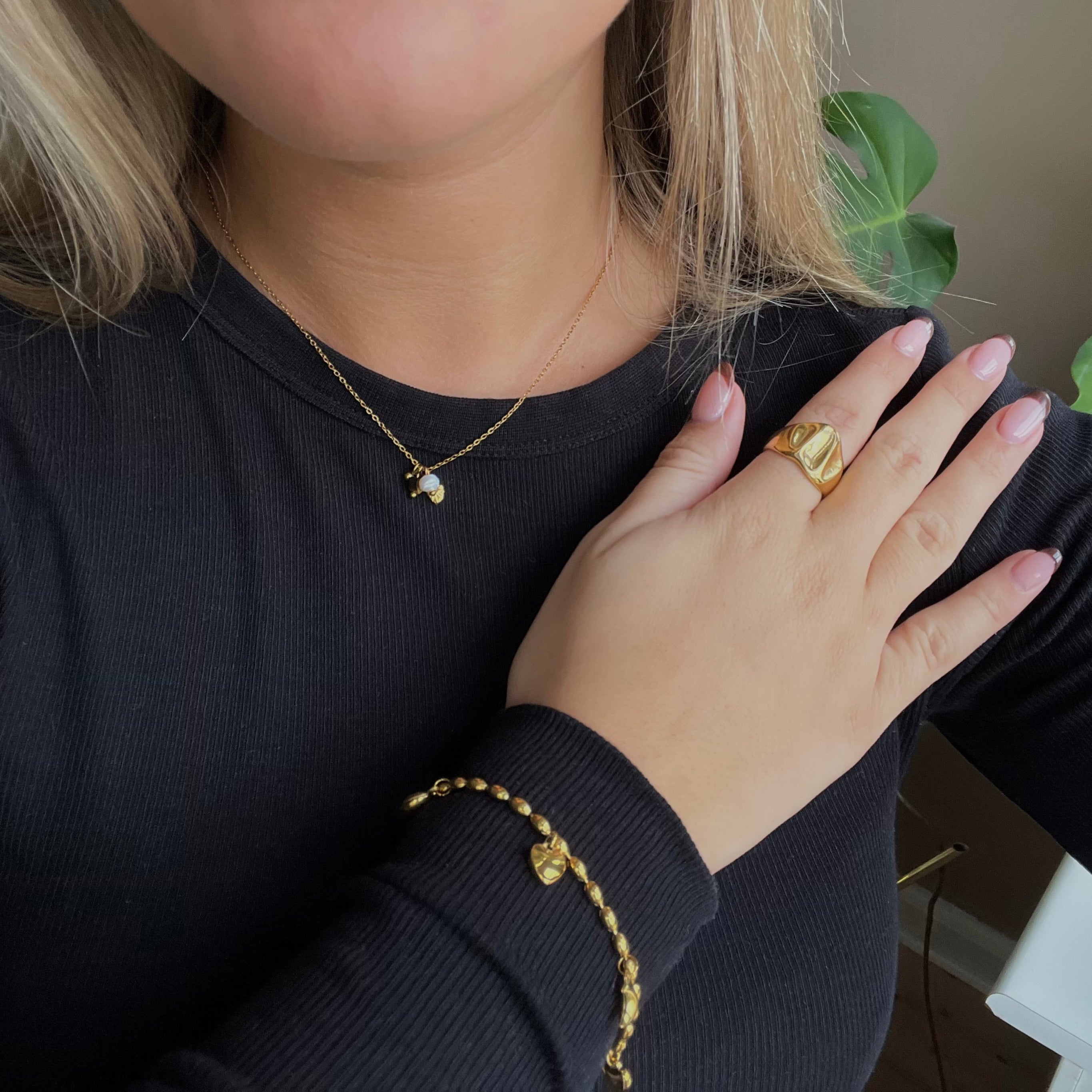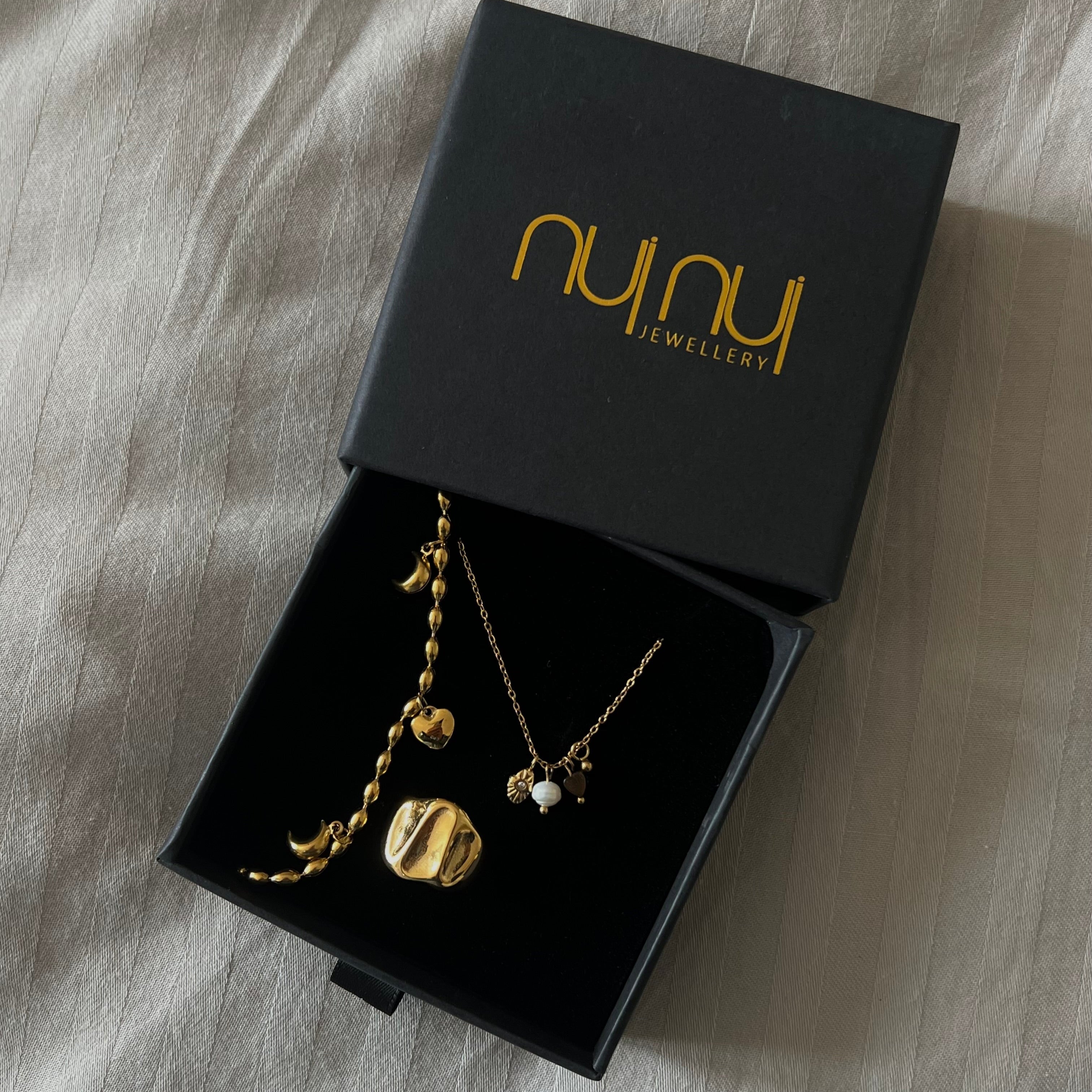 Smykkerne beholder sin guldglans år efter år, da vi har brugt en holdbar PVD ægte 18k guld forgyldning. De tåler daglig brug, håndvask og er modstandsdygtige over for ridser.