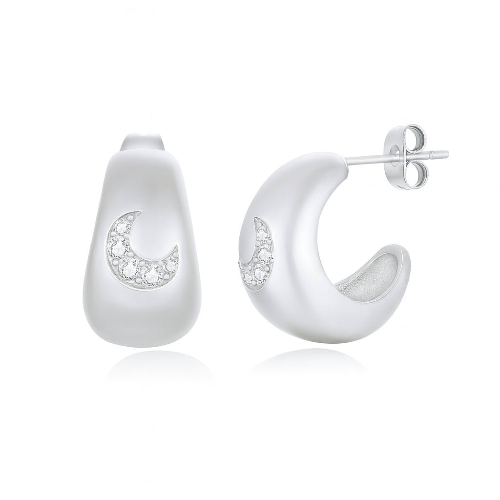 Øreringene er designet som et lille stykke nattehimmel, du kan bære hver eneste dag. Månen er håndsat med funklende zirkonia, og det hvide guld har den fineste matte silkeoverflade.