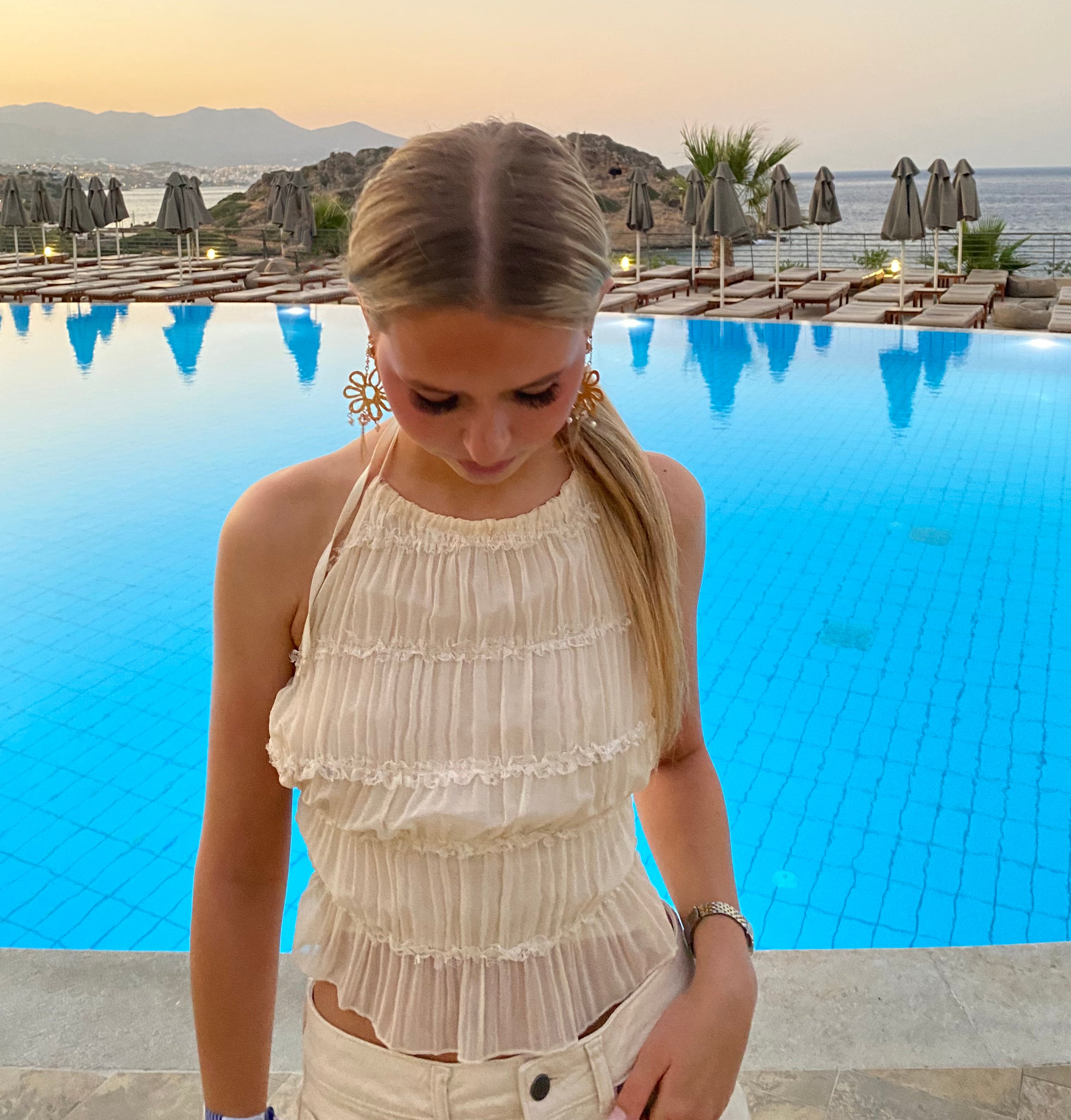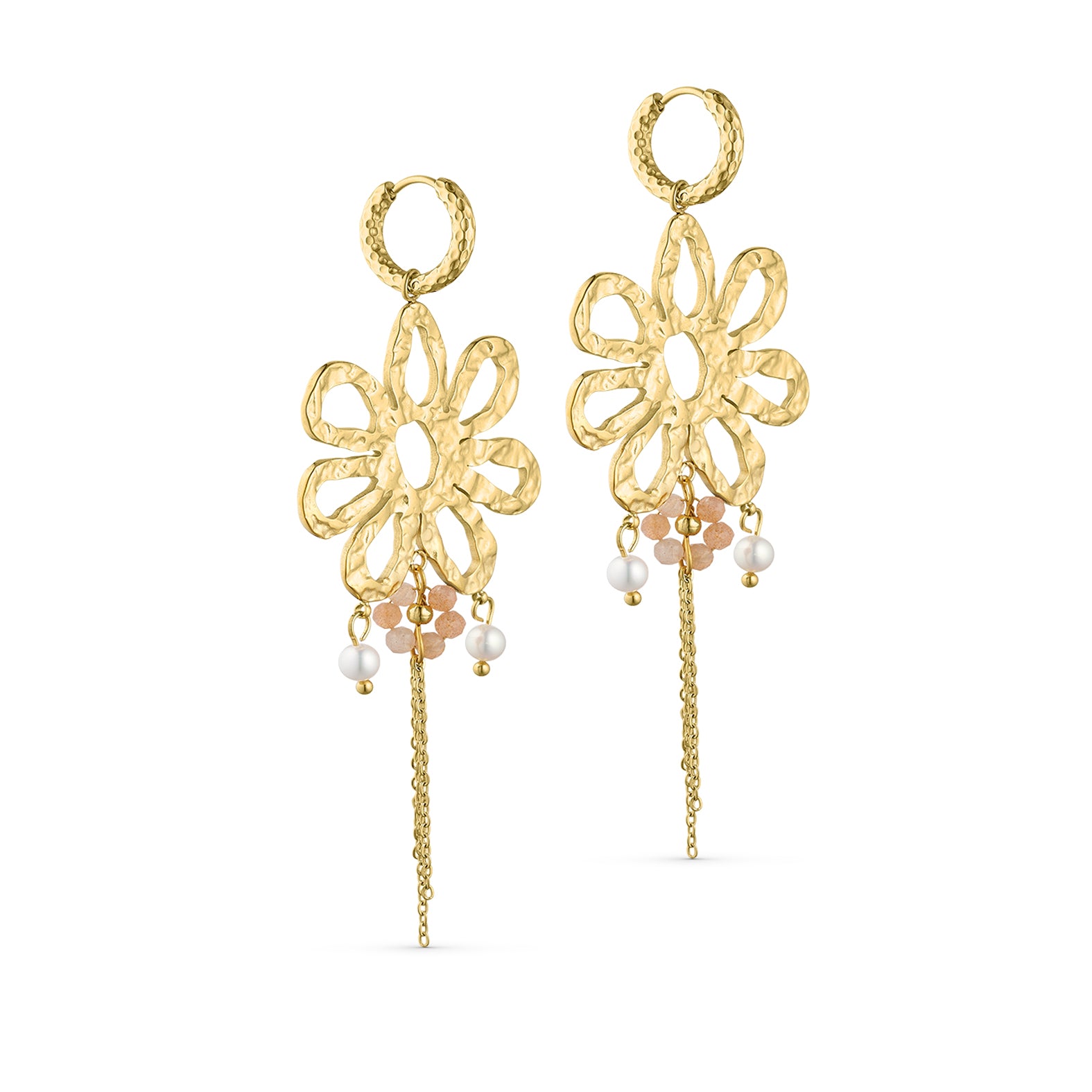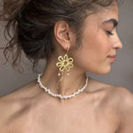 18k guldbelagt øreringe med stor blomst og perler.